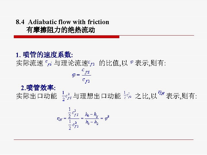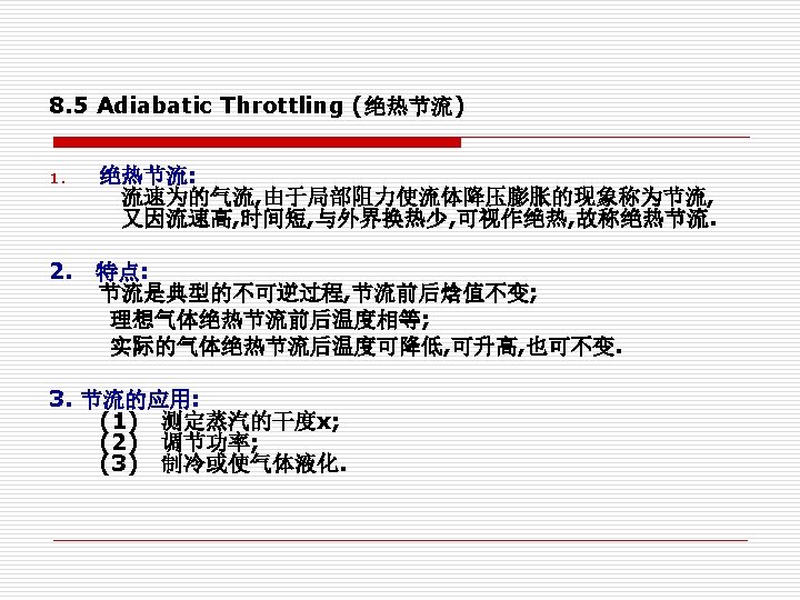 Chapter 8 Thermodynamics of High-Speed Gas Flow (第 8章 气体和蒸气的流动) l 8. 1 声速与马赫数 Velocity of Sound and Mach Number l 8. 2 一维定熵稳定流动 One dimensional Isentropic Steady Flow l 8. 3 喷管出口流速和流量的计算 Outlet Velocity and Flow rate Calculation for Nozzles l 8. 4具有摩擦的绝热稳定流动 Adiabatic steady flow with friction l 8. 5 绝热节流 Adiabatic throttling
