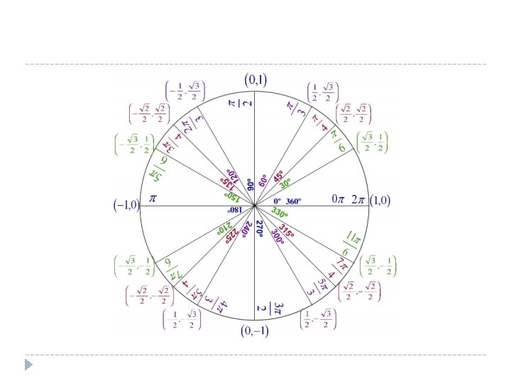 28. If q is a multiple of p/2, the coordinates of the points on the unit circle involve 0 and +1. 29. If q is a multiple of p/4, but not a multiple of p/2, the coordinates involve +√ 2 / 2. 30. If q is a multiple of p/6, but not a multiple of p/2, the coordinates involve + ½ and + √ 3 / 2.