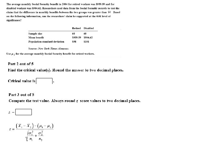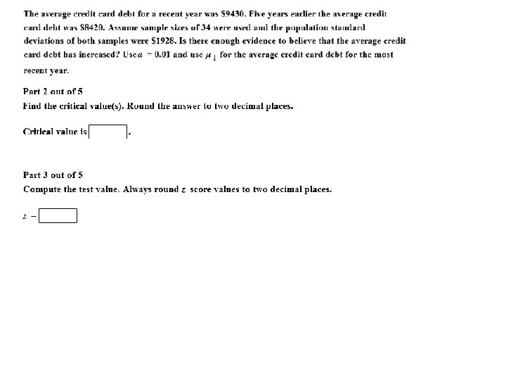 A survey found that the average hotel room rate in New Orleans is $88. 42 and the average room rate in Phoenix is $80. 61. Assume that the data were obtained from two samples of 50 hotels each and that the standard deviations of the populations are $5. 62 and $4. 83, respectively. At α = 0. 05, can it be concluded that there is a significant difference in the rates? Step 3: Computing the test value (by hand). If you must round intermediate steps, round to 4 decimal places, then round your final answer to 2 decimal places.