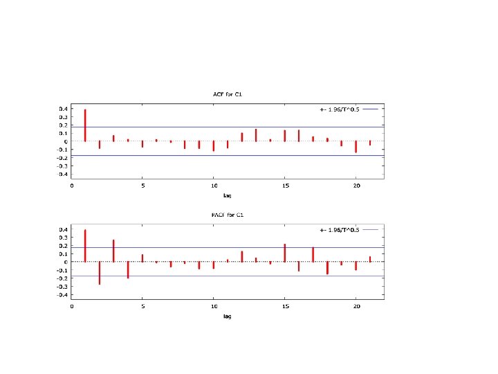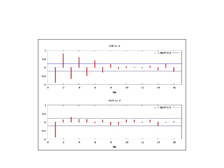 Model Identification • We use ACF (Autocorrelation function) and PACF (Partial Autocorrelation function). PACF measures the autocorrelation between Yt and Yt-k, when the effects of other time lags, 1, 2, . . , k-1, are removed