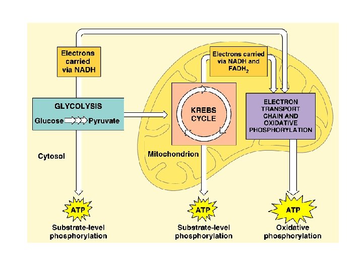 • Glycolysis occurs in the cytoplasm. • It begins catabolism by breaking glucose into two molecules of pyruvate. • The Krebs cycle occurs in the mitochondrial matrix. • It degrades pyruvate to carbon dioxide. • Several steps in glycolysis and the Krebs cycle transfer electrons from substrates to NAD+, forming NADH. • NADH passes these electrons to the electron transport chain. Copyright © 2002 Pearson Education, Inc. , publishing as Benjamin Cummings