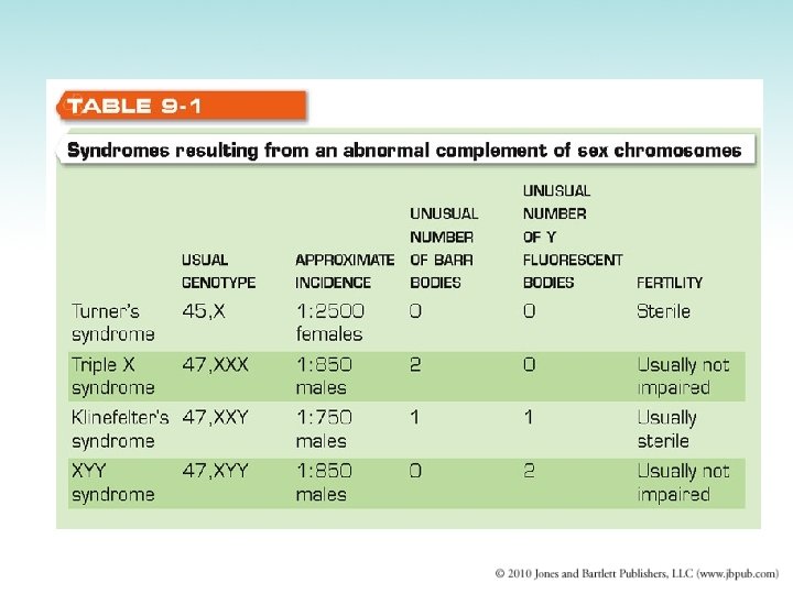 Sex Chromosome Abnormalities (2 of 3) • Two most common ones in the female – 1. Turner’s Syndrome: absence of one X chromosome – 2. Triple X Syndrome: extra X chromosome • Two most common ones in the male – 1. Klinefelter’s Syndrome: extra X chromosome – 2. XYY Syndrome: extra Y chromosome