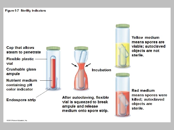 Physical Methods of Microbial Control • Heat-Related Methods – Moist heat – Autoclaving – Pressure applied to boiling water prevents steam from escaping – Boiling temperature increases as pressure increases – water boils at higher temp for longer – Autoclave conditions – 121ºC, 15 psi, 15 min © 2012 Pearson Education Inc.