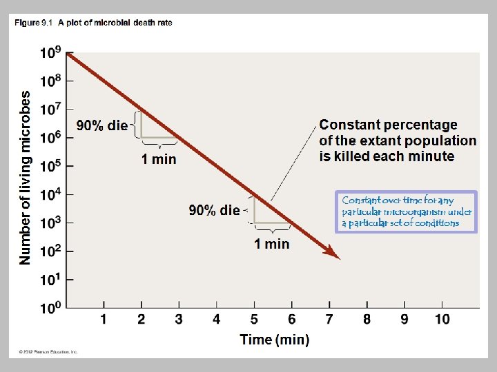 Physical Methods of Microbial Control • Heat-Related Methods – Effects of high temperatures – Denature proteins – Interfere with integrity of cytoplasmic membrane and cell wall – Disrupt structure and function of nucleic acids – Thermal death point – Lowest temperature that kills all cells in broth in 10 min – Thermal death time – Time to sterilize volume of liquid at set temperature © 2012 Pearson Education Inc.