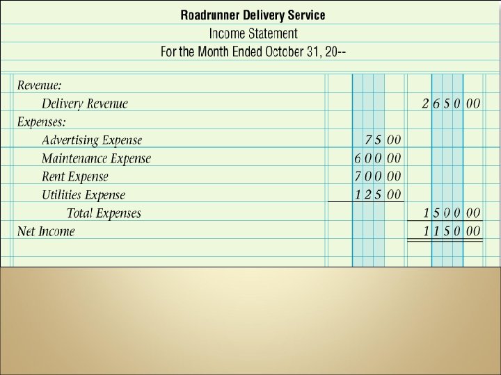 The Income Statement shows details about profitability income made or loss incurred in period Timeframe: for a specific period of time Source of Information: Income Statement Section of the Work Sheet