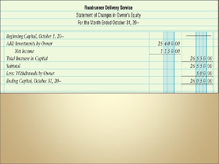 Statement of Changes in Owner’s Equity tracks increase/decrease in owner’s equity financial claims to assets of business