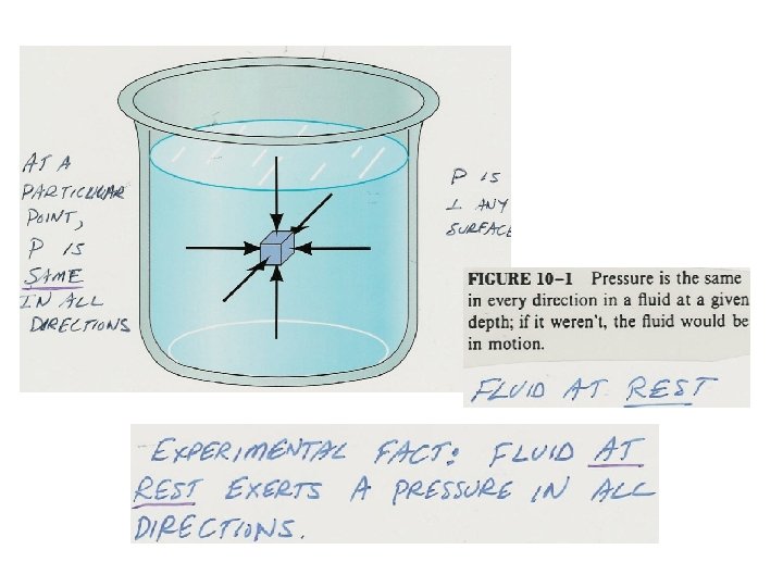 Consider a solid object submerged in a STATIC fluid as in the figure. The pressure P of the fluid at the level to which the object has been submerged is the ratio of the force (due to the fluid surrounding it in all directions) to the area At a particular point, P has the following properties : 1. It is same in all directions. 2. It is to any surface of the object. If 1. & 2. weren’t true, the fluid would be in motion, violating the statement that it is static!