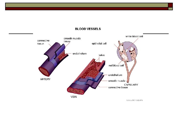 Arteries o o Blood vessel that carries blood away from the heart Made up of elastic fibres and smooth muscle Thin layer of epithelial cells reduces friction In measuring your pulse you can feel the artery contracting and expanding