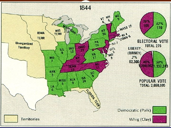 Election of 1844 v Annexing Texas was the HOT ISSUE!!! v Henry Clay opposed annexing it. v Didn’t want war with Mexico. <- James K. Polk supported annexing. - He also supported the reoccupation of the northern territory to gain northern support.