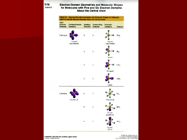 Shapes & Expanded Valence Greater than 4 electron domains (typically 5 or 6); noted by axial or equatorial position 5 domains = trigonal bipyramidal 6 domains = octahedral When placing lone pairs, minimize repulsions equatorial is better in bipyramidal geometry; octahedral all positions are symmetrical