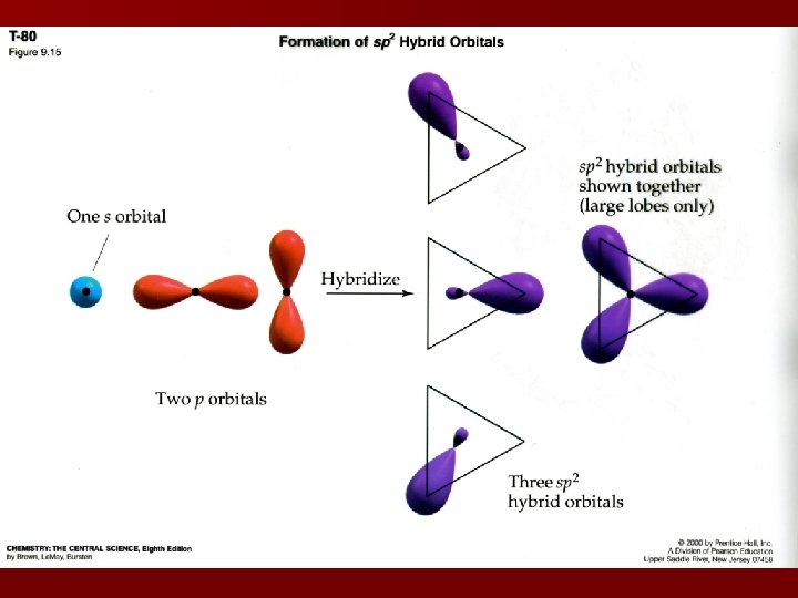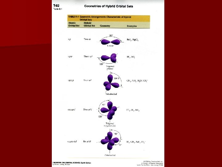 Hybridization & Shape Valence bond model equates: sp hybrids with a linear shape sp 2 hybrids with a trigonal planar shape sp 3 hybrids with tetrahedral geometries sp 3 d hybrids with bipyramidal geometries sp 3 d 2 hybrids with octahedral geometries Last two hybridizations occur in the 3 rd period elements or higher