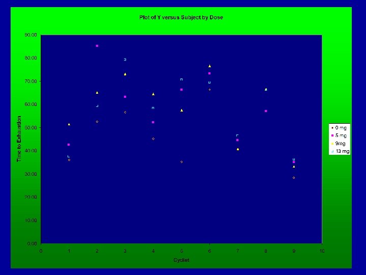 Example - Caffeine and Endurance • • Treatments: t=4 Doses of Caffeine: 0, 5, 9, 13 mg Blocks: b=9 Well-conditioned cyclists Response: yij=Minutes to exhaustion for cyclist j @ dose i Data: