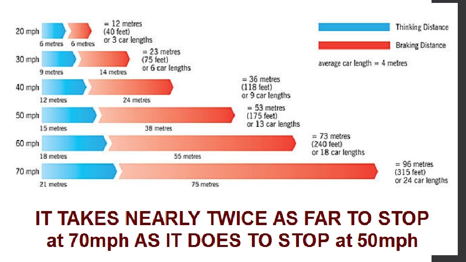 Total Stopping Distance • This is from the time you see a hazard until you get stopped. The faster you are travelling, the longer it will take you to stop. Total Braking Distance • From the time you apply the brake until the time you get stopped. • Stopping distances video https: //www. youtube. com/watch? v=KGk. KDa. Yd 3 Mo