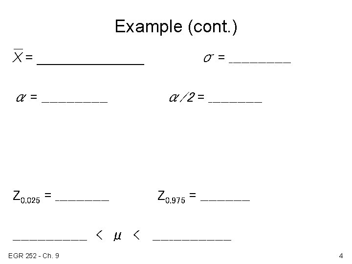 Example A traffic engineer is concerned about the delays at an intersection near a local school. The intersection is equipped with a fully actuated (“demand”) traffic light and there have been complaints that traffic on the main street is subject to unacceptable delays. To develop a benchmark, the traffic engineer randomly samples 25 stop times (in seconds) on a weekend day. The average of these times is found to be 13. 2 seconds, and the variance is known to be 4 seconds 2. Based on this data, what is the 95% confidence interval (C. I. ) around the mean stop time during a weekend day? EGR 252 - Ch. 9 3