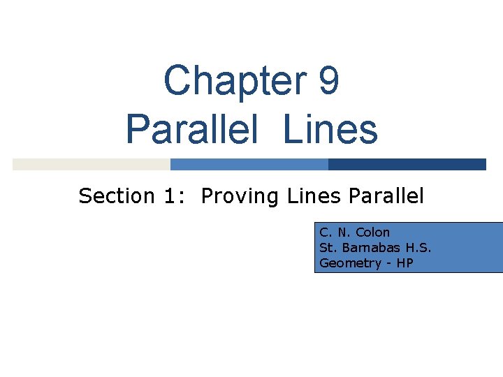 Chapter 9 Parallel Lines Section 1: Proving Lines Parallel C. N. Colon St. Barnabas H. S. Geometry - HP