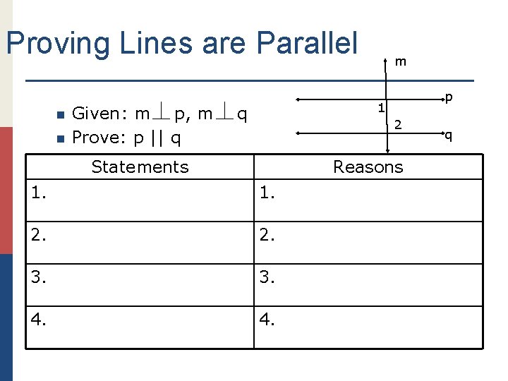 Proving Lines are Parallel n n Given: m p, m Prove: p || q m p 1 q 2 Statements Reasons 1. 2. 3. 4. q