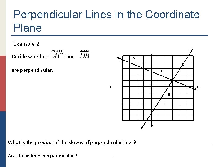 Perpendicular Lines in the Coordinate Plane Example 2 Decide whether and are perpendicular. A D C B What is the product of the slopes of perpendicular lines? _____________ Are these lines perpendicular? ______