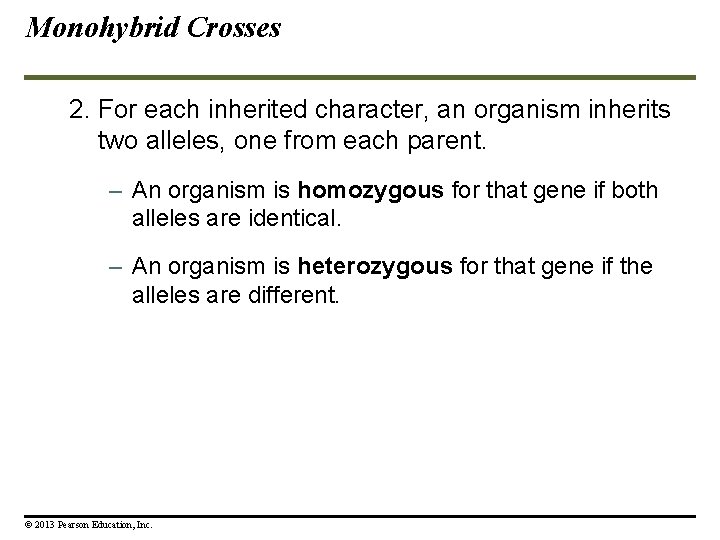 Monohybrid Crosses 2. For each inherited character, an organism inherits two alleles, one from each parent. – An organism is homozygous for that gene if both alleles are identical. – An organism is heterozygous for that gene if the alleles are different. © 2013 Pearson Education, Inc.