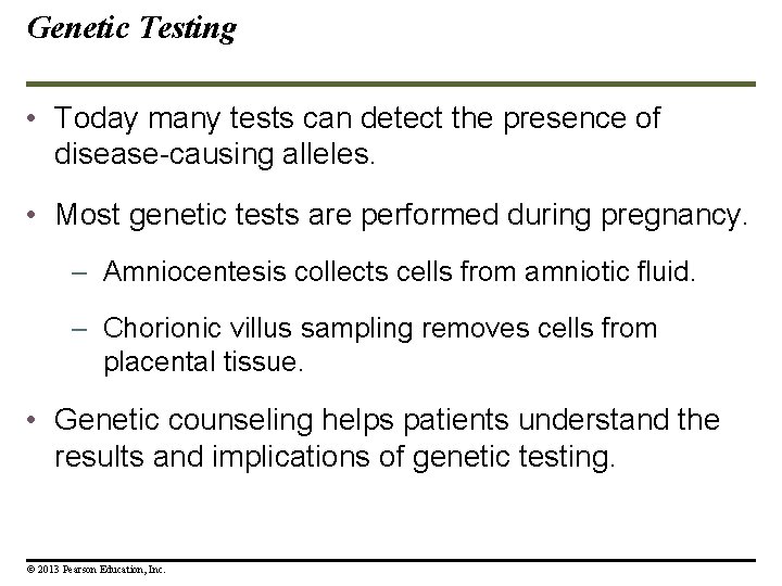 Genetic Testing • Today many tests can detect the presence of disease-causing alleles. • Most genetic tests are performed during pregnancy. – Amniocentesis collects cells from amniotic fluid. – Chorionic villus sampling removes cells from placental tissue. • Genetic counseling helps patients understand the results and implications of genetic testing. © 2013 Pearson Education, Inc.
