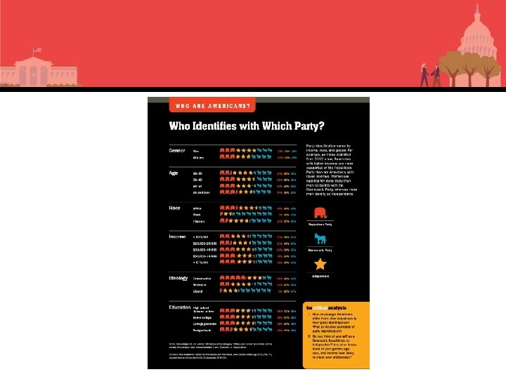 Parties and the Electorate: Gender and Religion • Gender and religion – More women identify as Democrats; more men identify as Republicans. – ~90 percent of Jews identify as Democrats. – White Catholics and Protestants are more likely to identify Republican. • Latino Catholics and Black Protestants, Democrats
