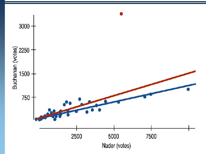 Unusual Points, Leverage, and Influence n Unusual points can strongly influence a regression. Even a single point far from the body of the data can dominate a regression analysis. n Any point that stands away from the others deserves your special attention. This scatterplot shows that something was awry in Palm Beach County, Florida, during the 2000 presidential election…