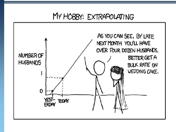 Predicting the Future – We Can’t!! n n n Extrapolation is especially dangerous when the xvariable in the model is time, extrapolation becomes an attempt to look into the future. Knowing that extrapolation is dangerous doesn’t stop people from doing it. The temptation to see into the future is hard to resist. My Advice: If you’re asked to extrapolate into the future, at least don’t believe the prediction will come true (and use weasel words liberally!!).