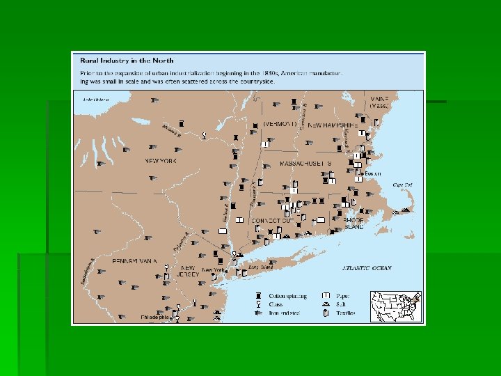 The Northeast § The Northeast region stretched from eastern Pennsylvania and New Jersey to New England. § Small family farms dotted the landscape and produced a surplus of goods. § People used the barter system for economic exchanges. Cash was rare. § The demand for heating fuel quickly depleted the region’s forests.