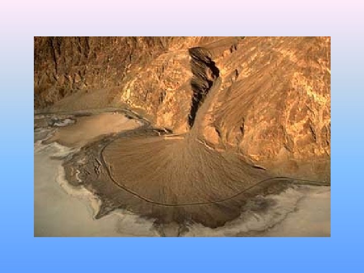 Deposition of Sediment • Steams that lose velocity also lose their ability to carry sediment. • A stream’s velocity lessens and its sediment load drops when its gradient abruptly decreases. • In dry regions, where mountain streams commonly flow down narrow valleys onto broad, flat, valley floors, a stream’s gradient may suddenly decrease causing the stream to drop its sediment as a fan-shaped deposit called an alluvial fan.