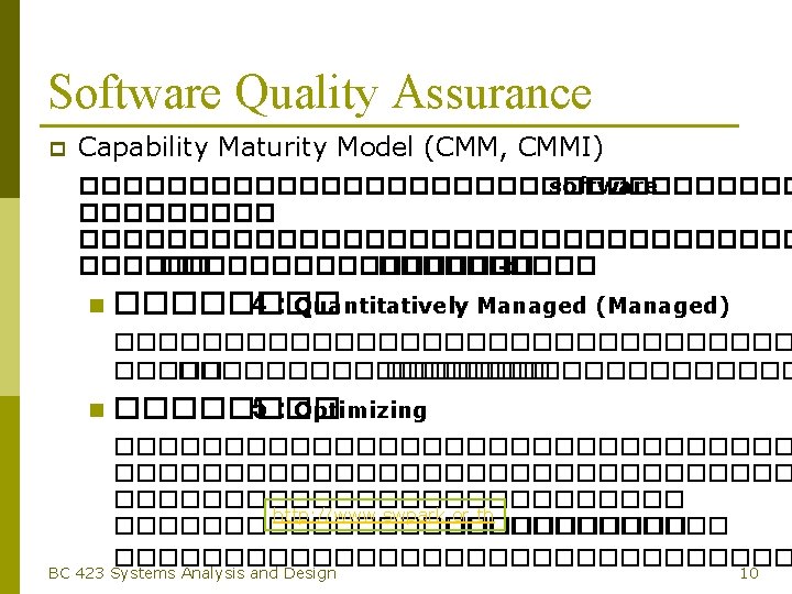 Software Quality Assurance Capability Maturity Model (CMM, CMMI) BC 423 Systems Analysis and Design 8