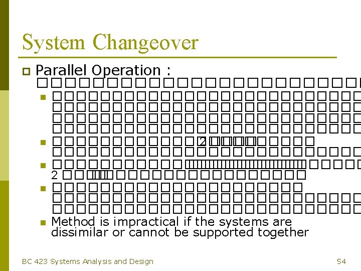 System Changeover p p System changeover : ���������������������� ����� -: n n Direct Cutover Parallel Operation Pilot Operation Phased Changeover ��������������������� The four system changeover methods. ����������� BC 423 Systems Analysis and Design ������� p 51