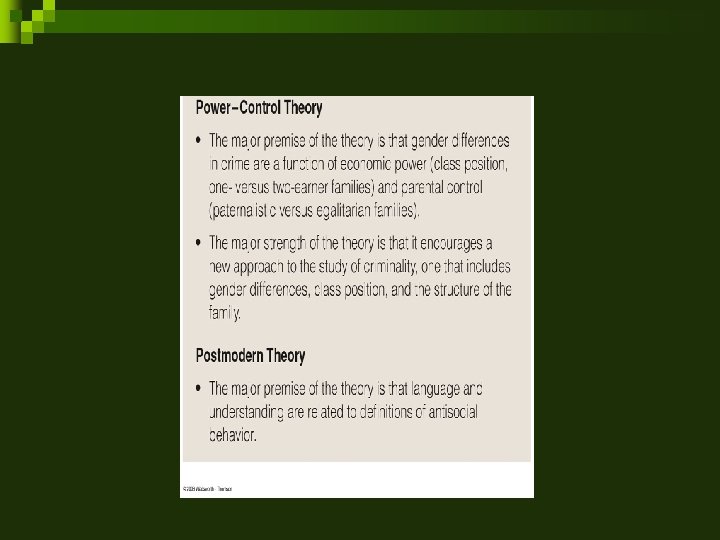 Power Control Theory A Radical Feminist Theory (John Hagan) n Crime and delinquency rates are a function of: Class Position (Power) Family Function (Control) n Parents’ work experiences and class position influence the criminality of their children. n In paternalistic families, male siblings exhibit a higher degree of delinquent behavior than their sisters. n In egalitarian families, daughters law-violating behaviors mirror their brothers’.