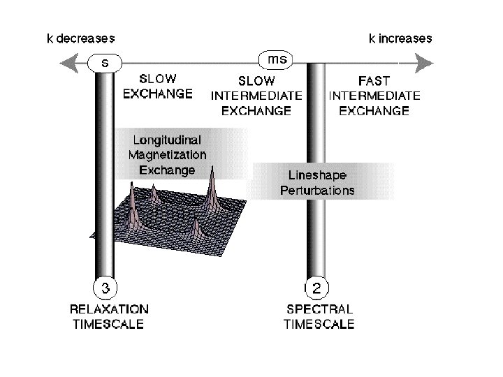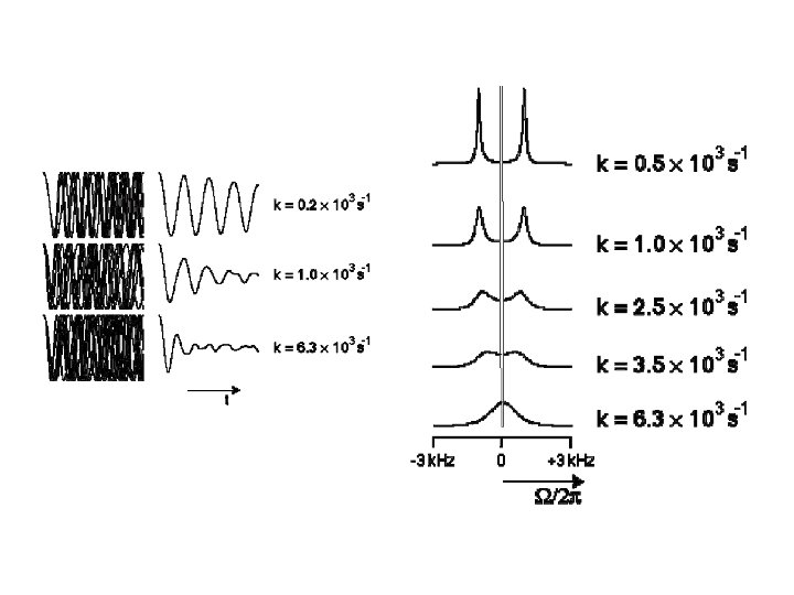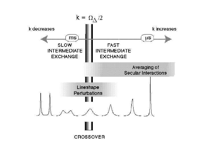 Motional linshapes and two-site exchange Symmetrical two-site exchange: k A k B The effect of the exchange process on the NMR spectrum depends on the difference in the chemical differences of the two sites, as compared to the exchange rate. = A 0 B 0 If the exchange rate constant has roughly the same magnitude as , then the system is said to be in the intermediate exchange regime.