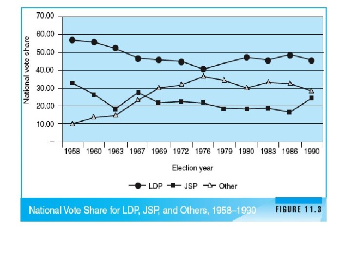 The Japanese Party System § Japanese party system combined multipartisim with the sustained dominance of one majority party. § The LDP § The Party System, 1946 -1955 § § § Somewhat chaotic Socialist Party - force in the Diet Japan Communist Party Japan Socialist Party Liberal Democratic Party § The Party System, 1955 -1993 § The 1960 s § The 1970 s § The 1980 s