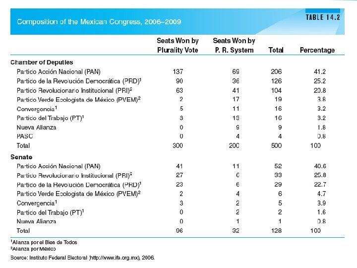Background: Mexico § 2000 election: Vincente Fox (PAN Party) § 2006 PRI lost the presidency but retained control of half of the state governorships § End result: Mexico has a more competitive, pluralistic political system, in which no single party is dominant but each of the three major parties has regional strongholds.
