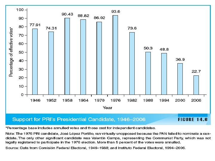 Historical Perspectives: The Era of Hegemonic Party Rule § Cardenas political system § Remarkably durable § PRI would become the world’s longest continuously ruling party (with the fall of the Soviet Communist Party) § In the 1970 s concerns arose § President Ordaz “dirty war” § Execution of more than 700 alleged enemies of the state § Good news: discovery of massive oil and natural gas resources, but this collapsed and so did support for reform § Economic crisis in the 1980 s § Carlos Salinas § Chiapas rebellion; Colosio assassination § 1994 Zedillo: PRI retained control