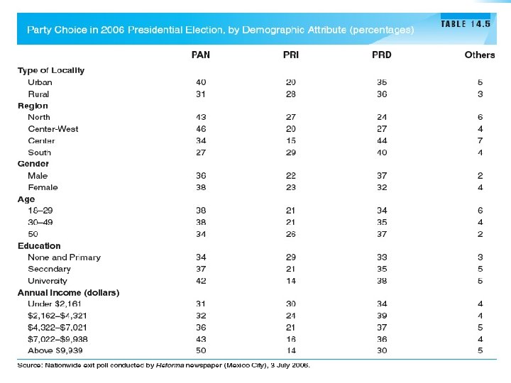 Political Parties: Shifting Social Bases § PRD did well among women in 2006. Women were focused on economic stability. § Education mattered less in 2006. § Social class mattered less as well. § Regional divides seemed to define the 2006 election.