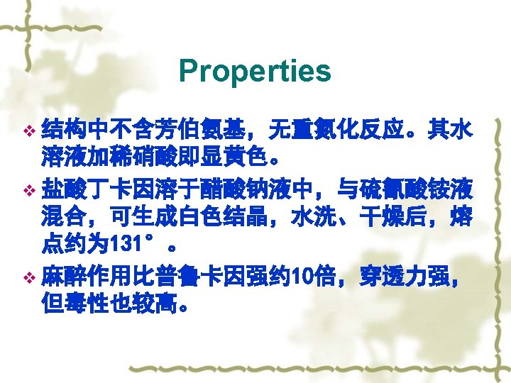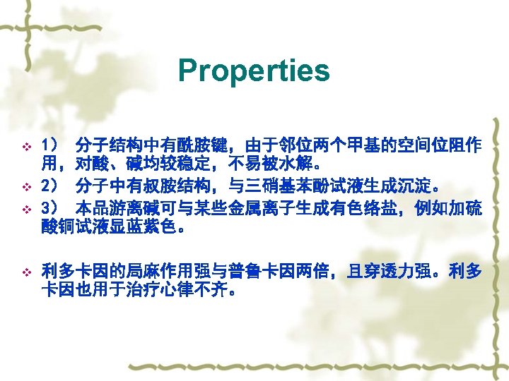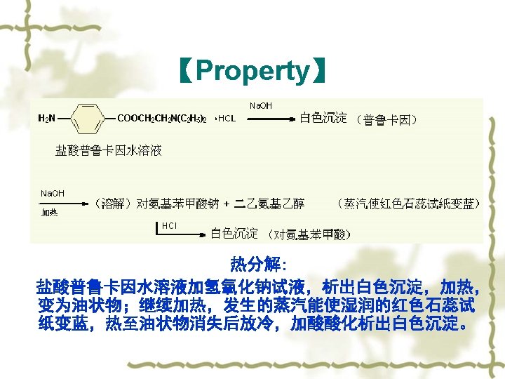 【Property】 v 1)酯基的水解 PABA DEAE k T, p. H: p. H 3~ 3. 5 stable, basic, neutral and acid condition accelerate this reaction. v. Metabolites: PABA and DEAE.