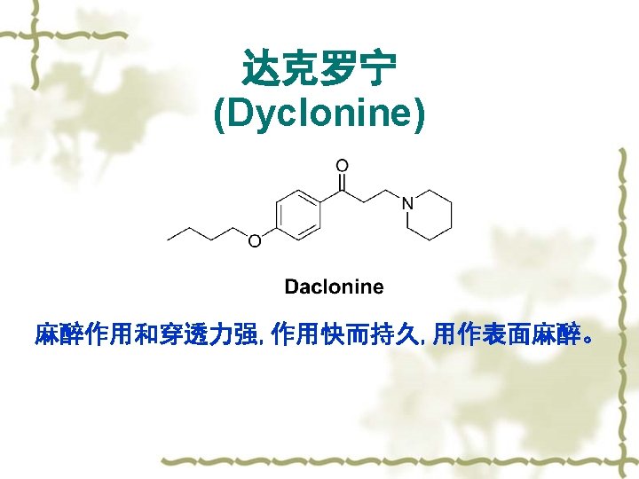 1. 2 Structure Type of LA 1. 2. 3 氨基酮类 Amino ketones -CH 2 - ~ -OTD: 1. 达克罗宁 Dyclonine 临床常用 2. 法立卡因 Falicaine more active and penetrable, 速效持久,表面麻醉