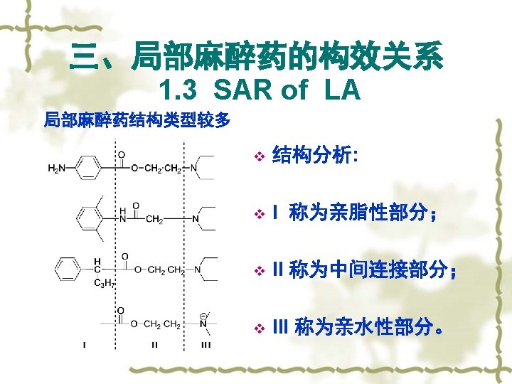 Summary v LA and GA v TD|:Procaine,Lidocaine, Ketamine; v SAR of LA: 3 main parts (hydrophilic ability / lipophilic ability); v Structure nonspecific drug。