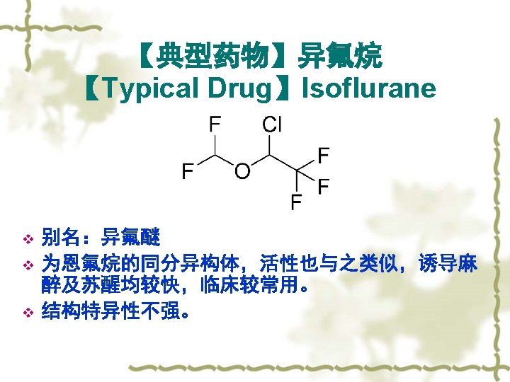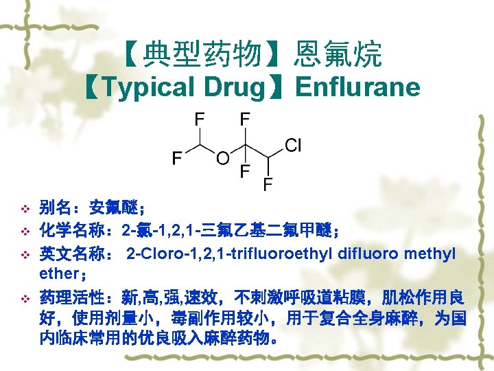 Chemical Structures of Some Drugs 药物的中英文名称对照 氧化亚氮(Nitrous Oxide);麻醉乙醚(Anesthetic Ether), 氟烷(Halothane, Fluothane);甲氧氟烷(Methoxyflurane), 恩氟烷(Enflurane);异氟烷(Isoflurane), 七氟烷(Sevoflurane);地氟烷(Desflurane)等。