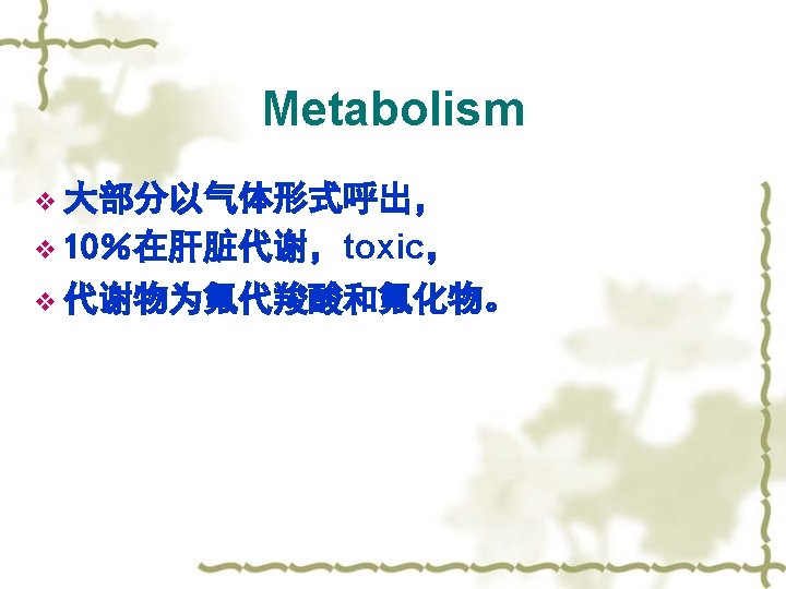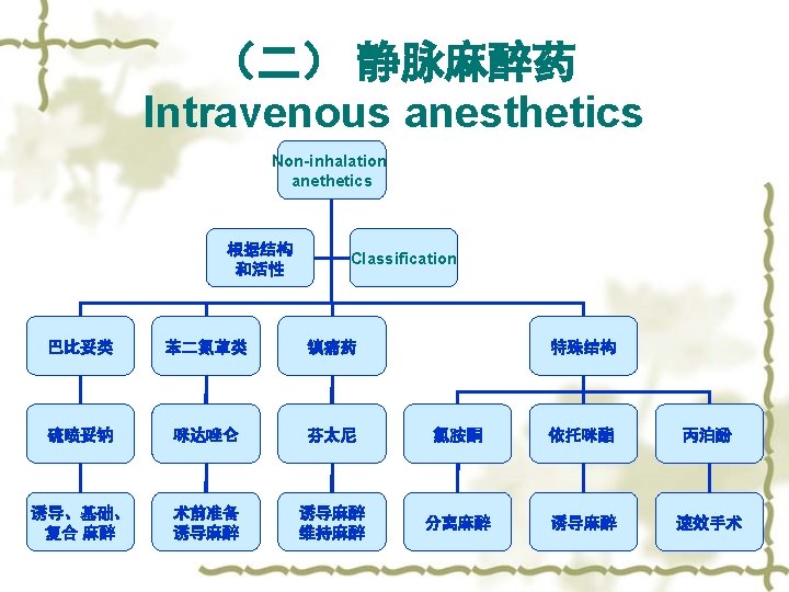 第二节 全身麻醉药 Section II General Anesthetics 全麻药 根据给药途径不同 Classification 吸入麻醉药 Inhalation Anesthetics 静脉麻醉药 Intravenous Anesthetics 挥发性麻醉药 Volatile Anesthetics 不具有挥发性 Involatile