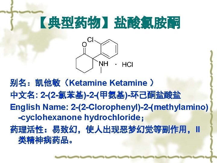 Chemical Structures of Some Drugs 药物名称的中英文对照 硫喷妥钠(Thiopental Sodium); 海索比妥钠(Hexobarbital sodium); 氯胺酮(Ketamine); 羟丁酸钠(Sodium Hydroxybutyrate),又称:γ-羟丁酸钠。