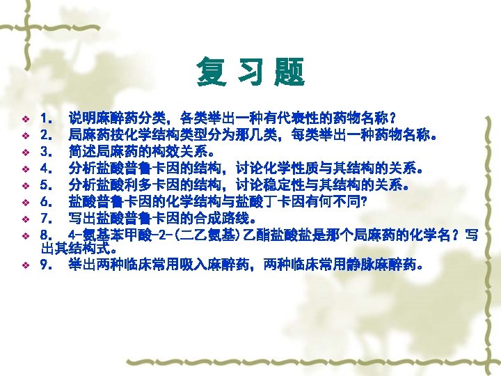 Summary-2012 -09 -06 v The classification of anesthetics; LA and GA; v Typical Drug Procaine,Lidocaine The chemical structure of TD; The properties and synthesis of TD; SAR of TD ; v Question: Why is Lidocaine more stable than Procaine?