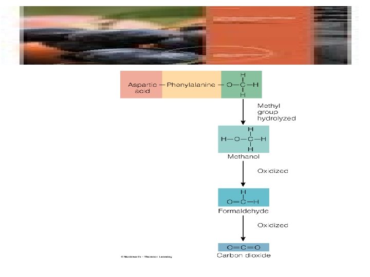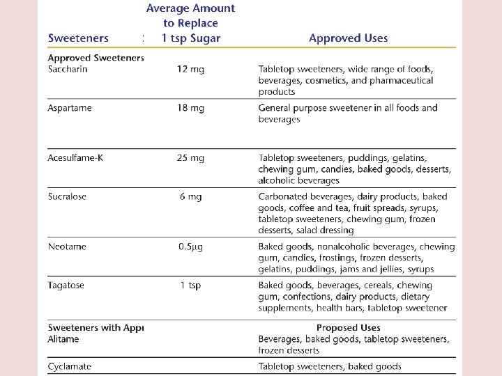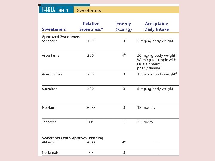 Aspartame: • Aspartame is 200 times sweeter than sucrose • Used in 4000 products worldwide, soft drinks, whipped toppings, jellies, cereals, puddings, medicines • Products carry a label warning people with phenylketonuria (PKU).