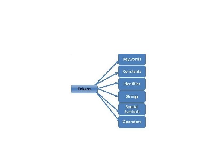 tokens – keyword – identifier – Constant number – string-literal – operator – Punctuator (special symbol) • Punctuation characters such as brackets ([ ]), braces ({ }), parentheses ( ( ) ), and commas (, ) are also tokens.