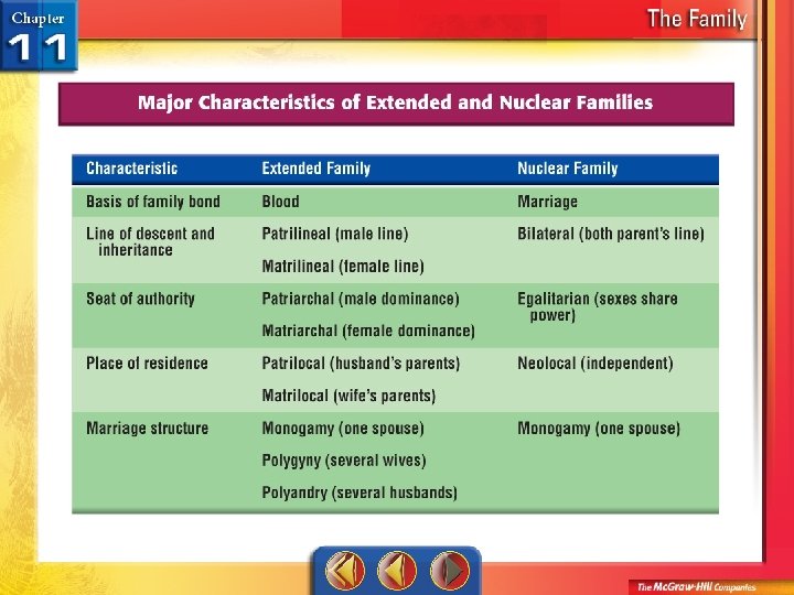 Patterns of Family Structure • Depending on the arrangement, inheritance varies: – Patrilineal—descent and inheritance are passed from the father to his male descendents. – Matrilineal—descent and inheritance are transmitted from the mother to her female descendents. – Bilateral—descent and inheritance are passed equally through both parents.