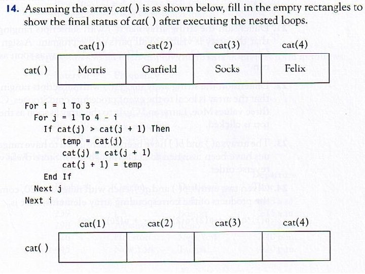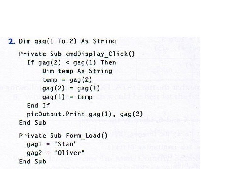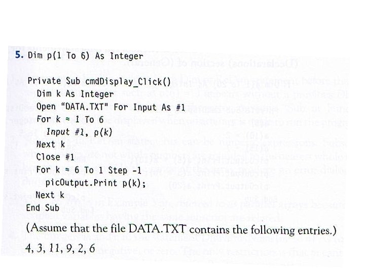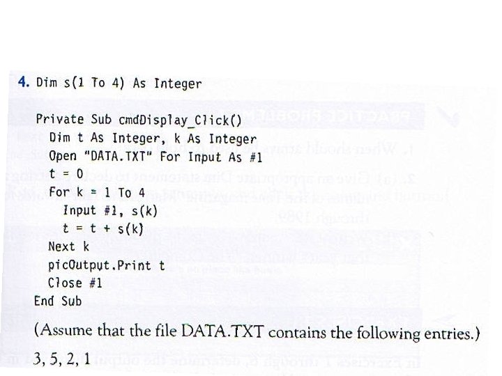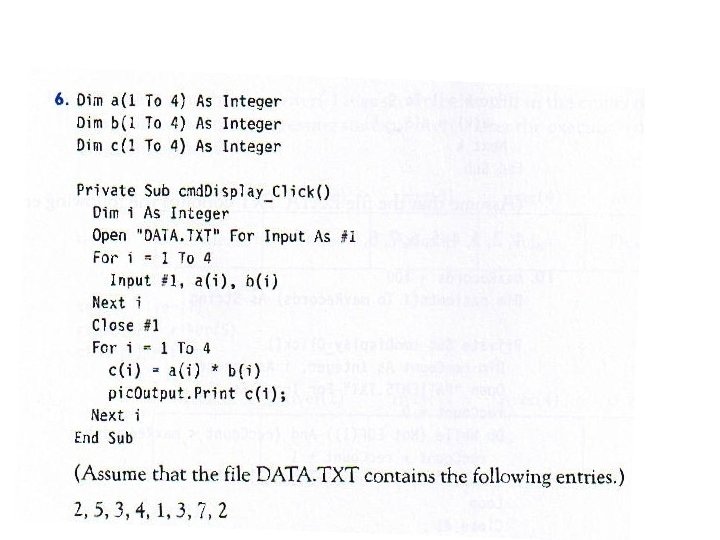 • • • • What is the output of: Private Sub cmd. Button_Click() Dim i As Integer, a(1 To 4) As integer Open "DATA. TXT" For Input As #1 For i = 1 To 4 Input #1, a(i) Next i For i = 4 To 1 Step -2 pic. Box. Print a(i); Next i End Sub Contents of DATA. TXT: 1, 3, 5, 7