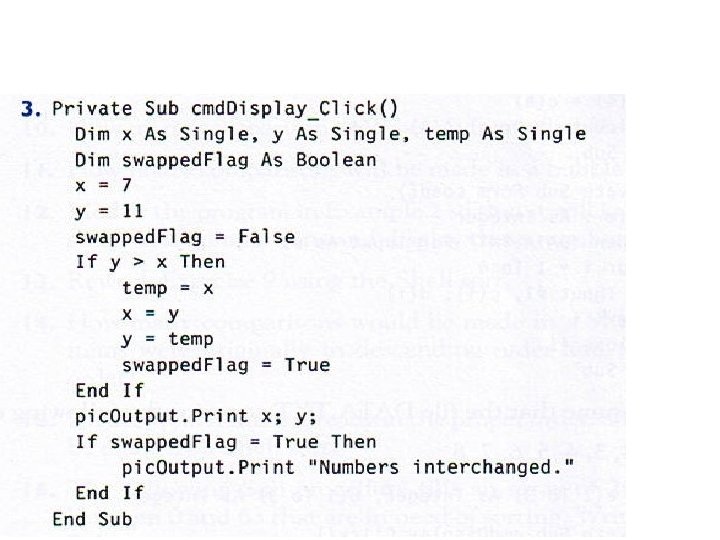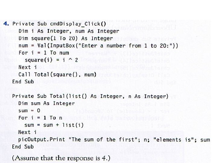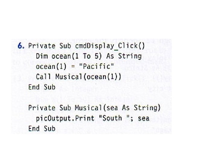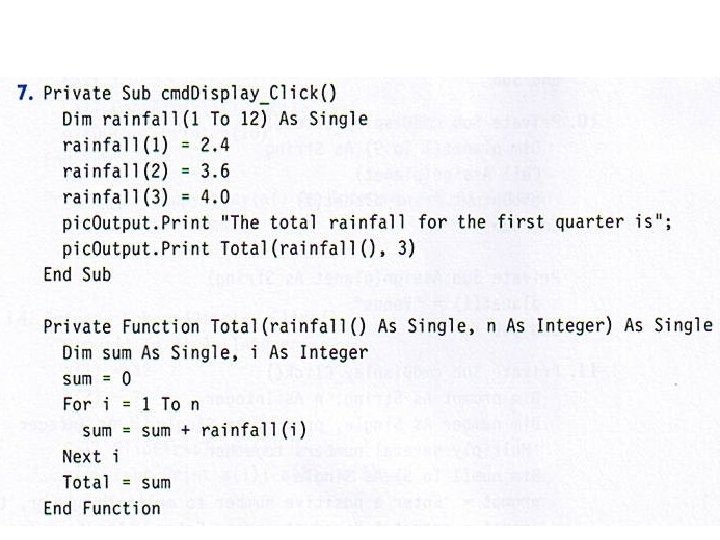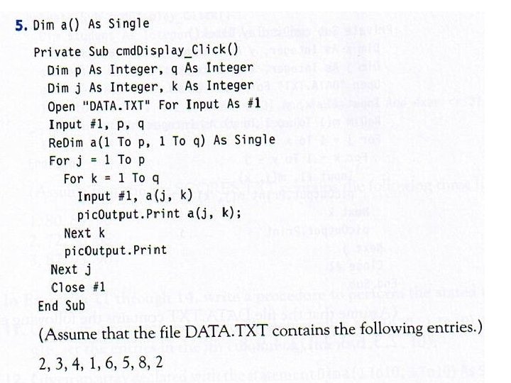 • • • • Dim a(-2 To 5), b As Integer Dim i As Integer, j As Integer Open "DATA. TXT" For Input As #1 num = 0 For i = 3 To 5 Input #1, a(i) Next i For j = -1 To 1 Input #1, k b = b + a(k) Next j pic. Box. Print b Contents of DATA. TXT: 2, 1, 0, -1, 3, 3