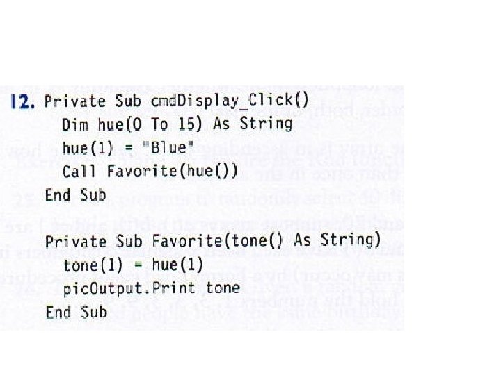 12. hue will be unknown in the Sub procedure. Also, in the Print statement in the Sub procedure, tone needs a subscript.