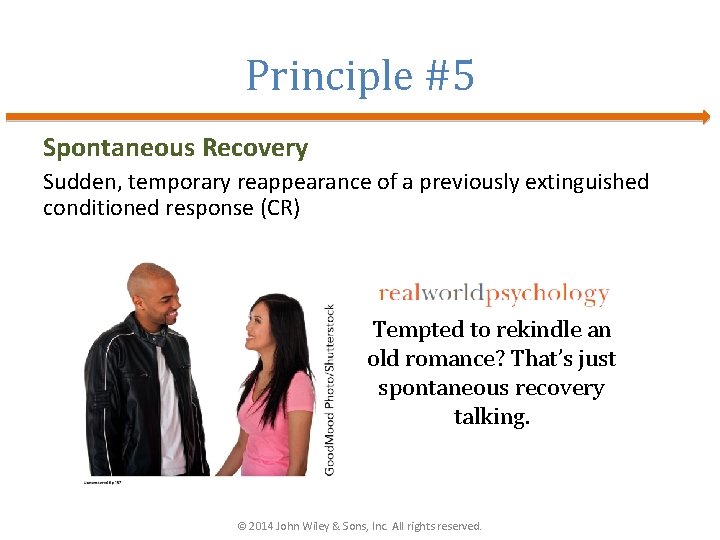 Principle #5 Spontaneous Recovery Sudden, temporary reappearance of a previously extinguished conditioned response (CR) Tempted to rekindle an old romance? That’s just spontaneous recovery talking. © 2014 John Wiley & Sons, Inc. All rights reserved.